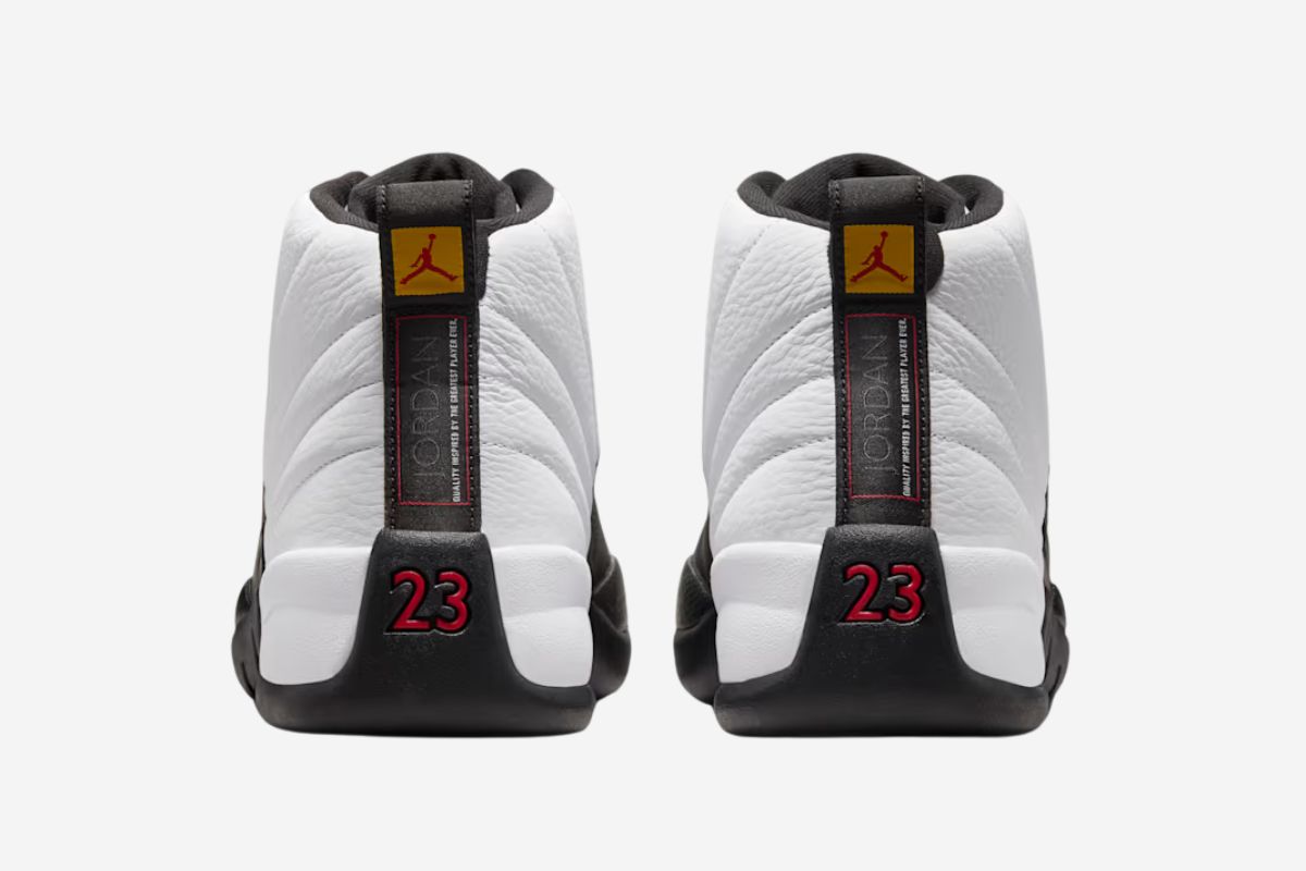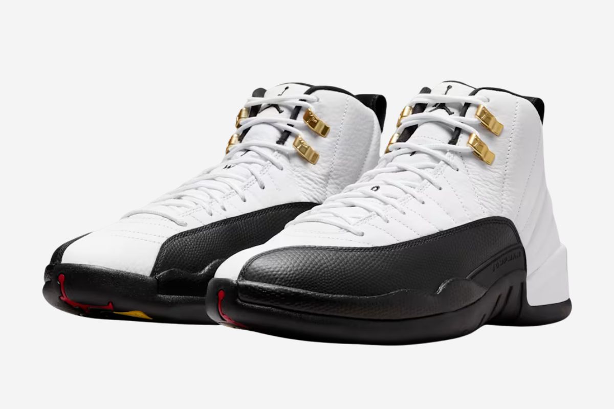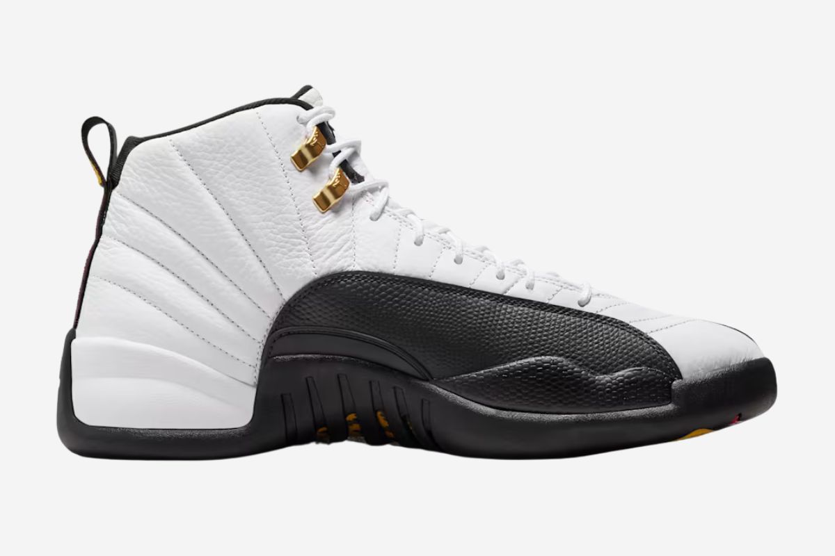 The 2025 edition of the Air Jordan 12 Retro ‘Taxi’ revives an OG colorway, featuring a white leather upper with radiating stitch lines and upper molded eyelets in metallic gold.