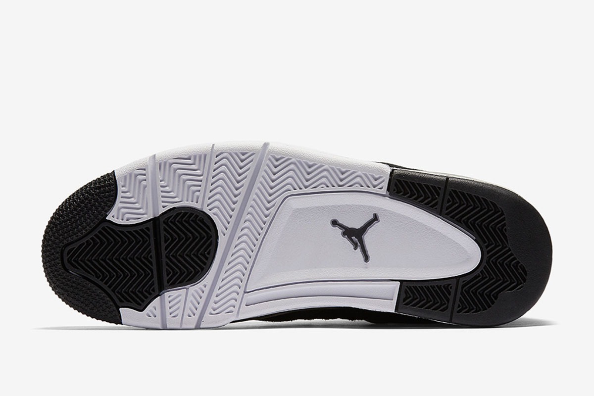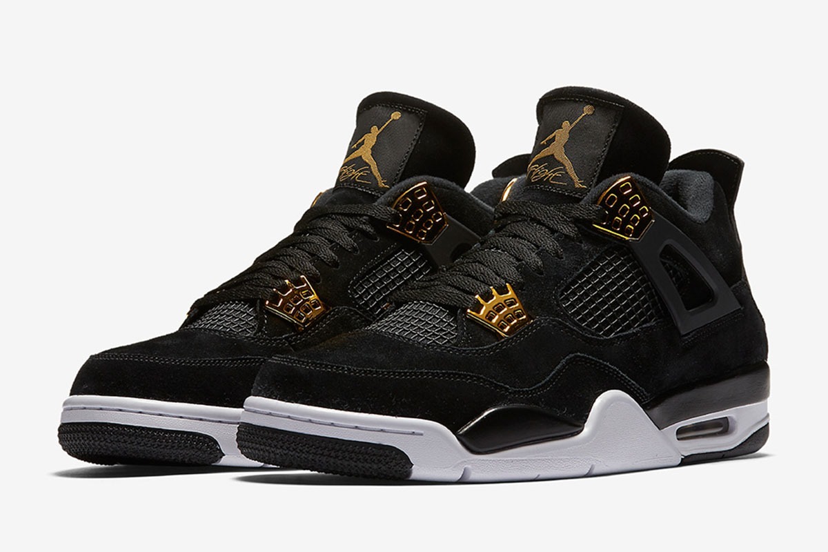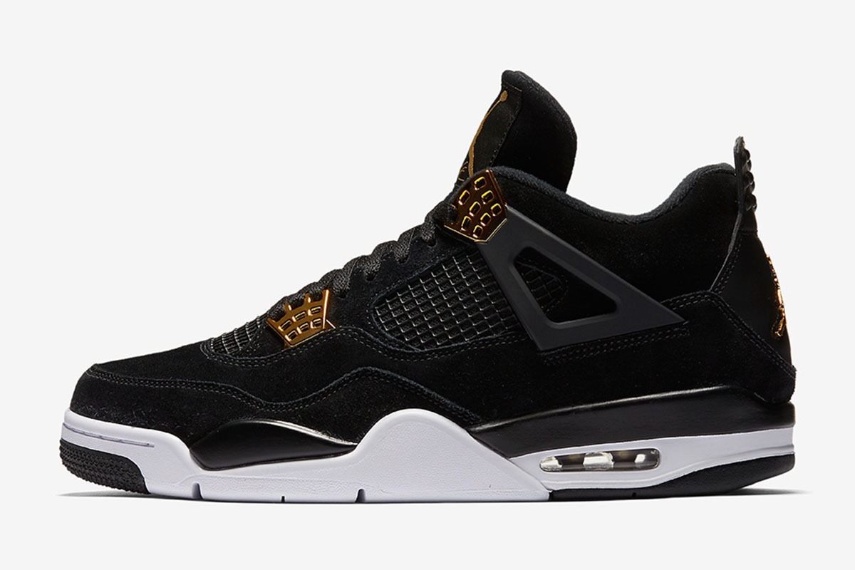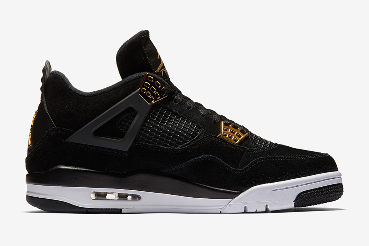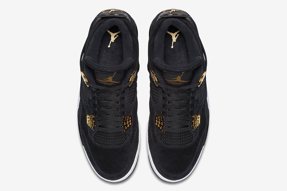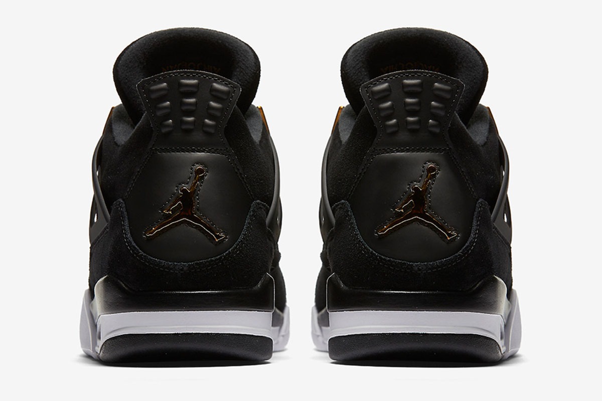 The Air Jordan 4 Retro ‘Royalty’ pairs a monochromatic black suede upper with contrasting metallic gold accents.