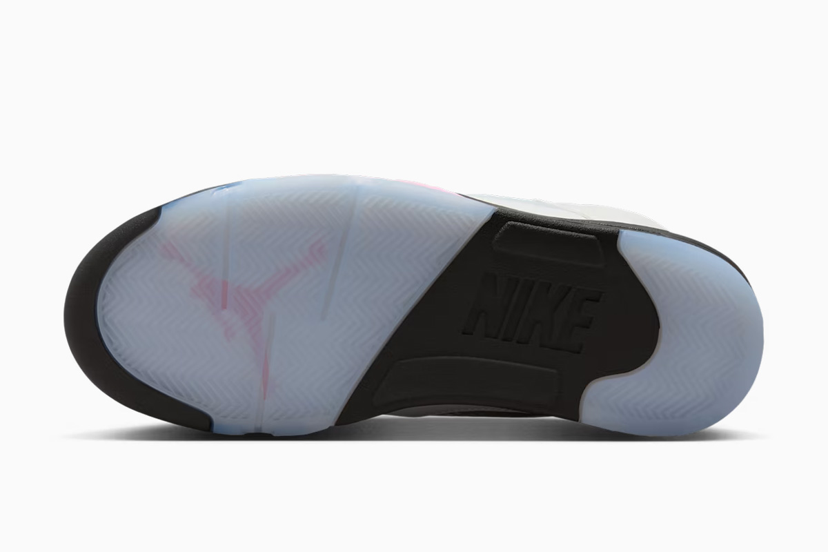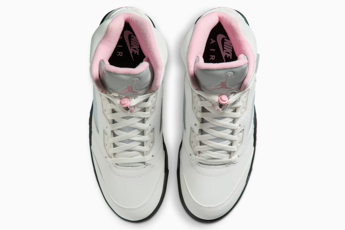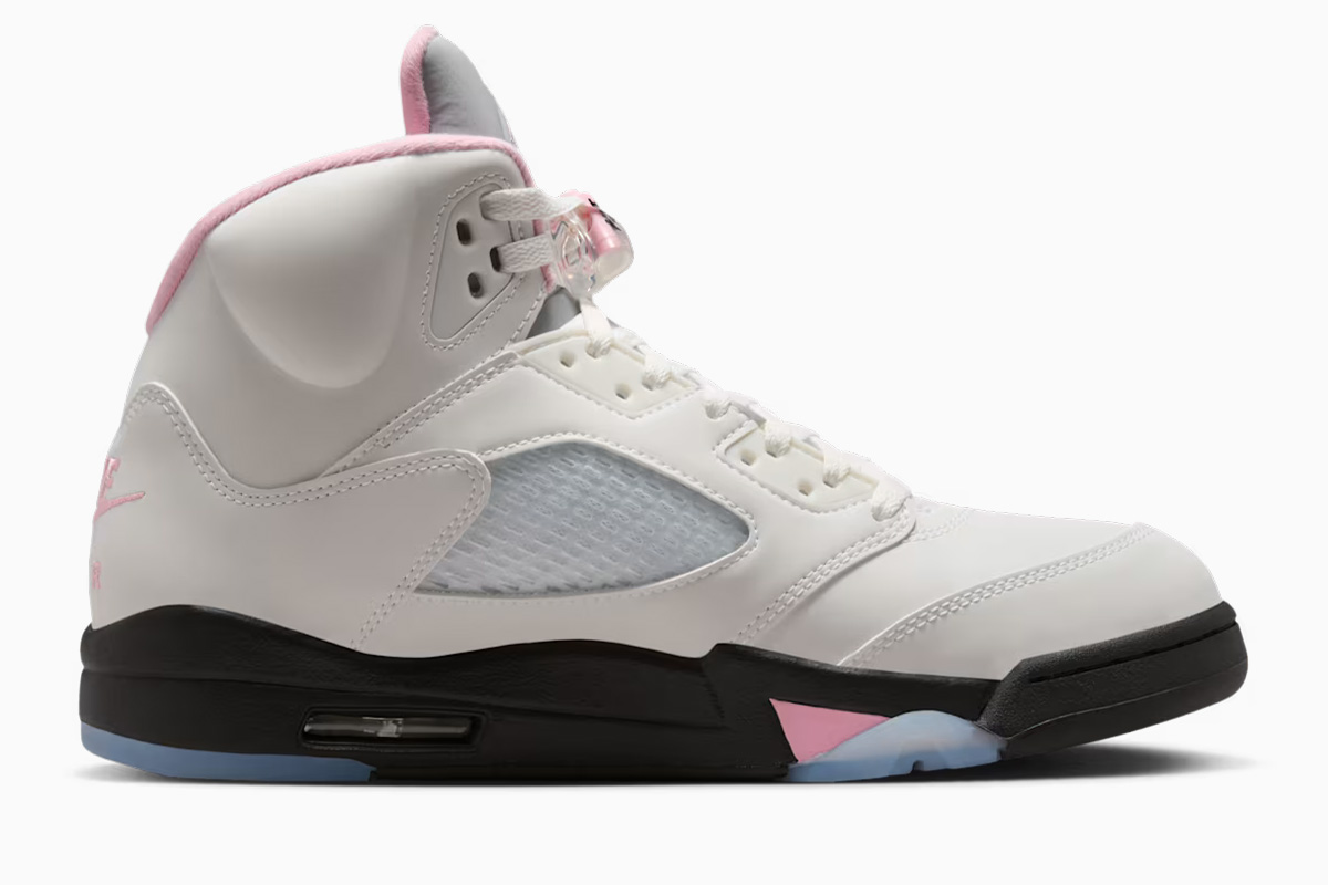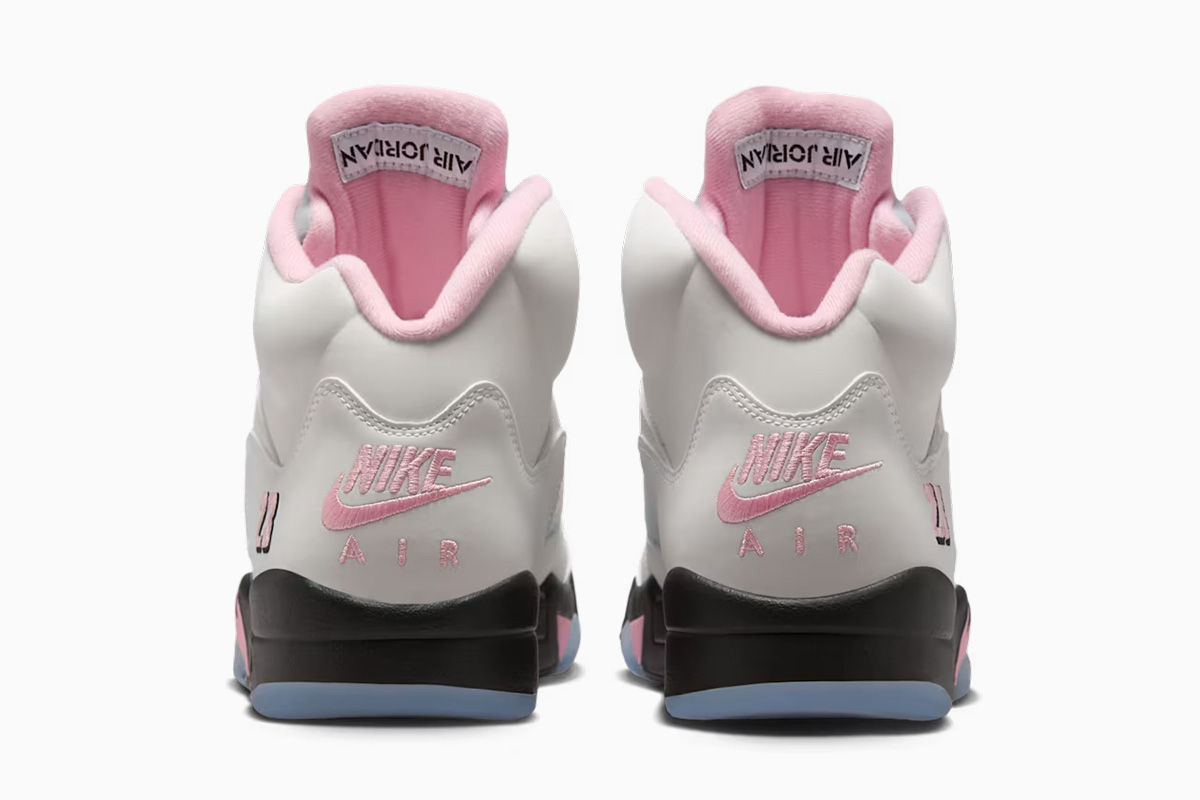 The Air Jordan 5 Retro ‘Medium Soft Pink’ showcases a white leather upper that is treated to a 3M finish, featuring translucent quarter panel netting and a pink embroidered ’23’ on the lateral heel.