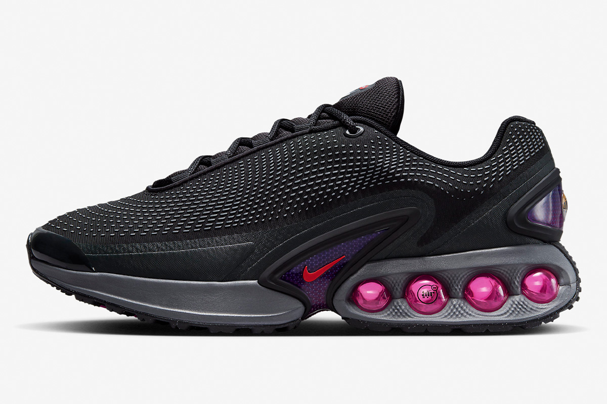 The Nike Air Max DN ‘All Night’ showcases a grey injected Phylon midsole with a pink-tinged Dynamic Air system — a dual-chamber, four-tubed Nike Air unit nestled in the heel. With each step, air flows freely between the tubes in each chamber, delivering a smooth transition and a comfortable ride. Black textile is utilized on the upper, featuring a haptic textured overlay and a TPU heel counter. The latter is marked with a circular DN Air Max badge.