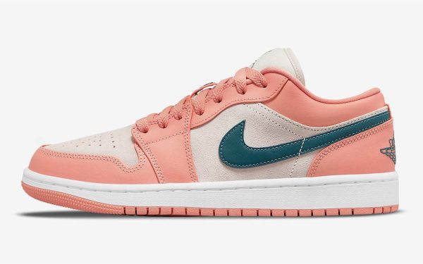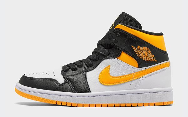 This offering of the mid-top Air Jordan 1 features White smooth leather on the side panels, perforated leather overlays with University Gold covering the toes, ankle flaps and mesh tongues.